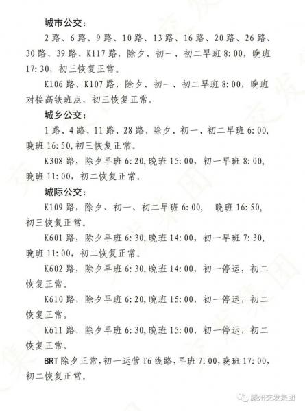 為方便市民春節(jié)期間出行,結(jié)合客流實(shí)際,現(xiàn)將春節(jié)期間集團(tuán)各運(yùn)營(yíng)線路運(yùn)營(yíng)時(shí)間進(jìn)行調(diào)整,敬請(qǐng)各位乘客相互轉(zhuǎn)告,合理安排出行。順祝各位新春快樂(lè),闔家幸福!