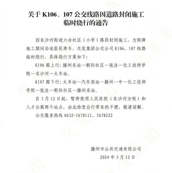 關(guān)于K106、107公交線路因道路封閉施工臨時繞行的通告