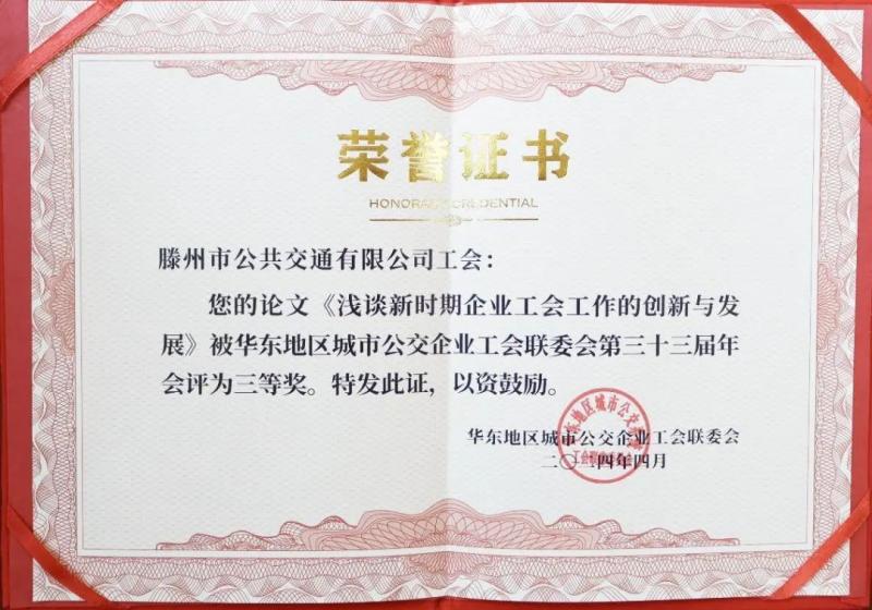 近日,華東地區(qū)城市公交企業(yè)工會(huì)聯(lián)委會(huì)面向華東地區(qū)六省一市各公交客運(yùn)單位開(kāi)展優(yōu)秀論文征集,交發(fā)集團(tuán)公交公司工會(huì)積極響應(yīng),撰寫(xiě)的《淺談新時(shí)期企業(yè)工會(huì)工作的創(chuàng)新與發(fā)展》論文在華東地區(qū)公交企業(yè)工會(huì)聯(lián)委會(huì)第三十三屆年會(huì)上榮獲三等獎(jiǎng)。